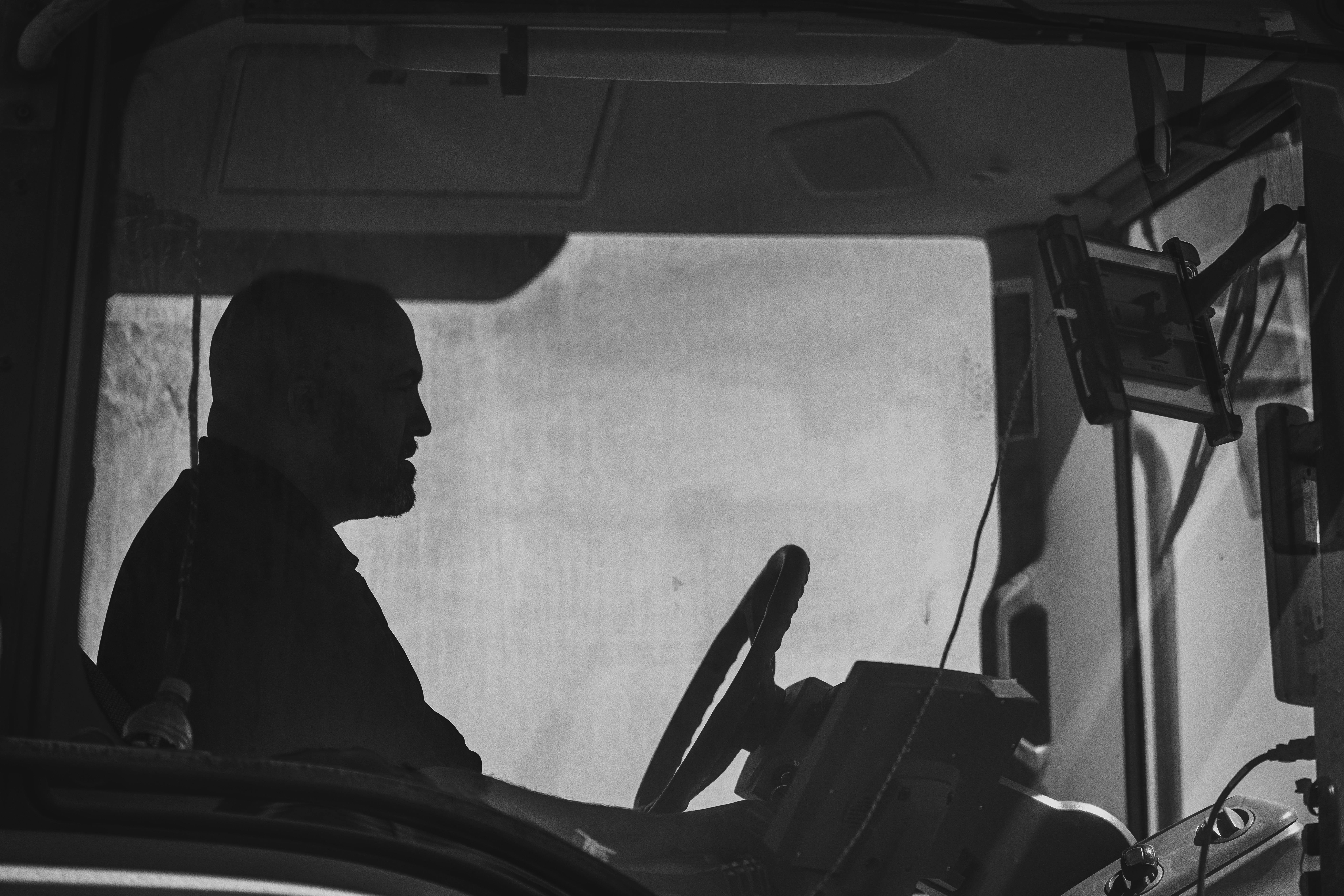 Black and white silhouette of a man driving a truck, capturing a candid moment. Photo Credit: Pexels @Mark Stebnicki